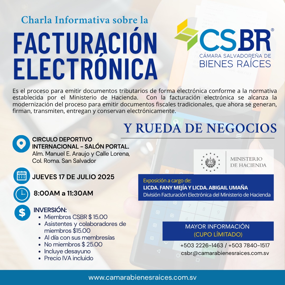 La Junta Directiva de la Cámara Salvadoreña de Bienes Raíces, le invita a participar en Charla Informativa sobre FACTURACIÓN ELECTRÓNICA, a cargo de funcionarias de la División de Facturación Electrónica del Ministerio de Hacienda, y RUEDA DE NEGOCIOS. 🏠👩🏻💼 A realizarse de 8:00AM a 11:30AM, el próximo Jueves 17 de Julio de 2025 en las instalaciones del Círculo Deportivo Internacional (CDI).